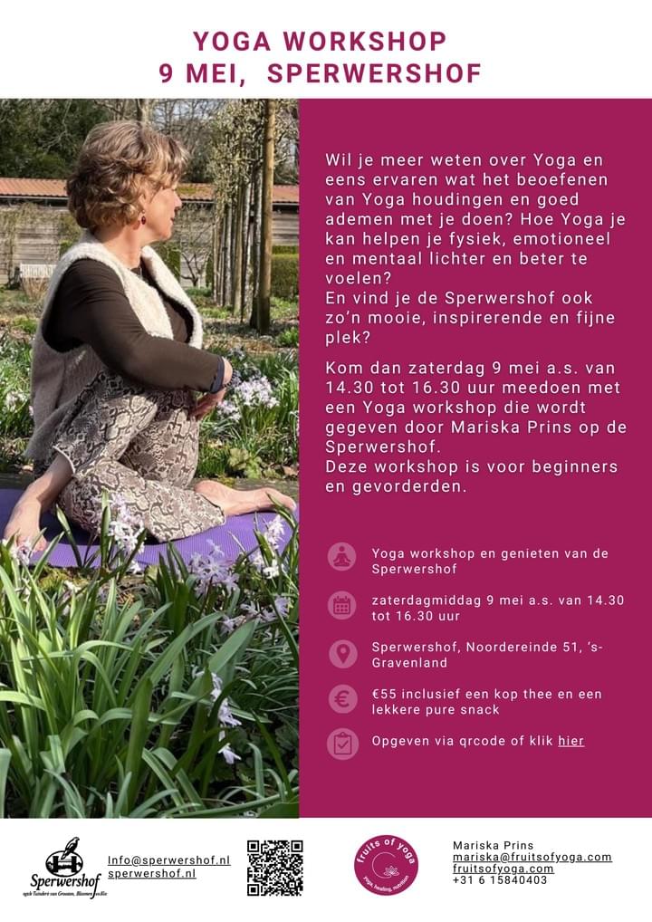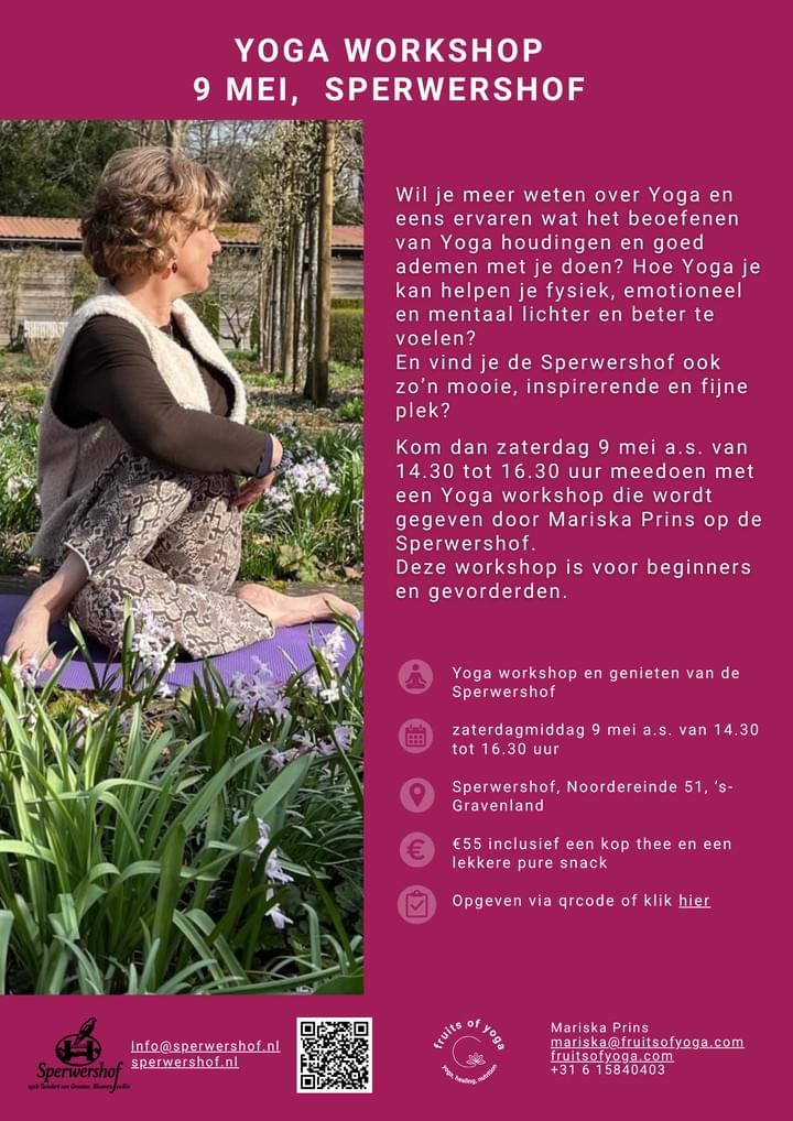 Kom dan zaterdag 9 mei a.s. van 14.30 tot 16.30uur meedoen met een Yoga workshop die wordt gegeven door Mariska Prins op de Sperwershof.